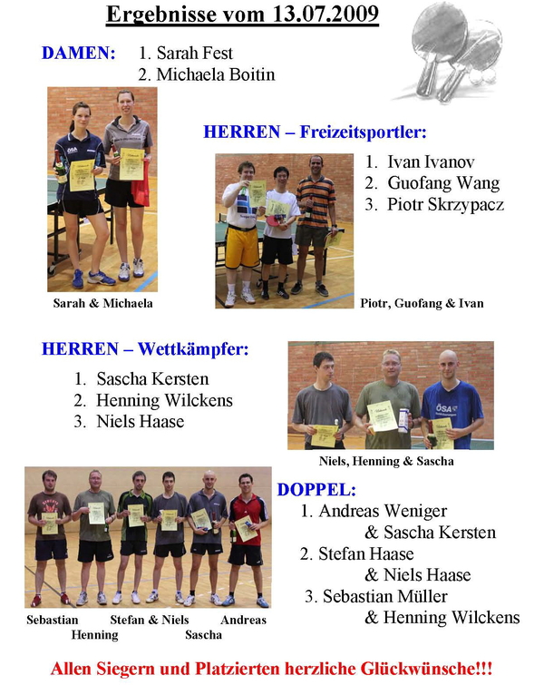 Auch in dieser Saison lud das Sportzentrum der Otto-von-Guericke-Universität Magdeburg zur Uni-Meisterschaft im Tischtennis am 13. Juli ein. Dabei konnten Wettkämpfer und Freizeitsportler der Universität und der Hochschule Magdeburg-Stendal (FH) teilnehmen. Besonders stark waren die SpielerInnen des TTC Börde Magdeburg vertreten. Bei den Wettkämpfern errang Sascha Kersten den ersten Platz vor Henning Wilckens (beide TTC). Den dritten Platz erreichte Niels Haase, der ebenfalls beim TTC trainiert, aber für ESV Lok Beucha spielt.